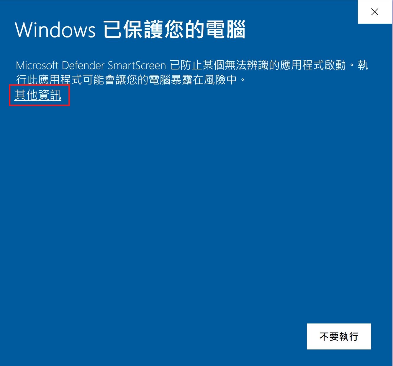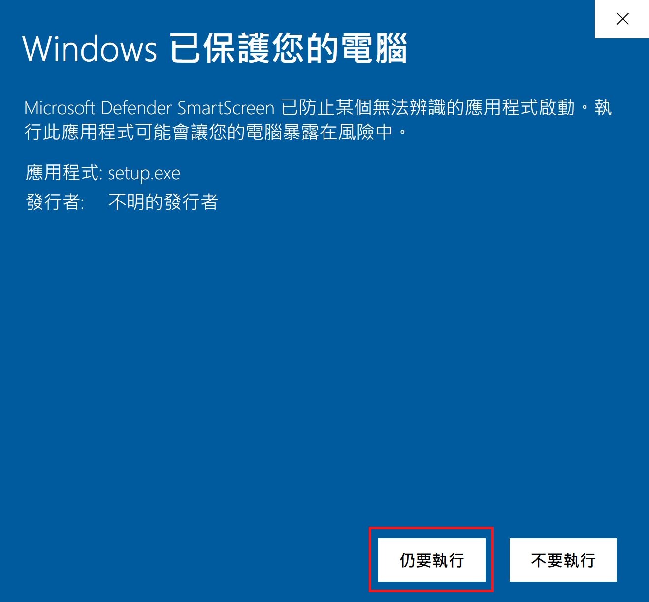安裝時,請選擇 "其他資訊",再選擇 "仍要執行"。